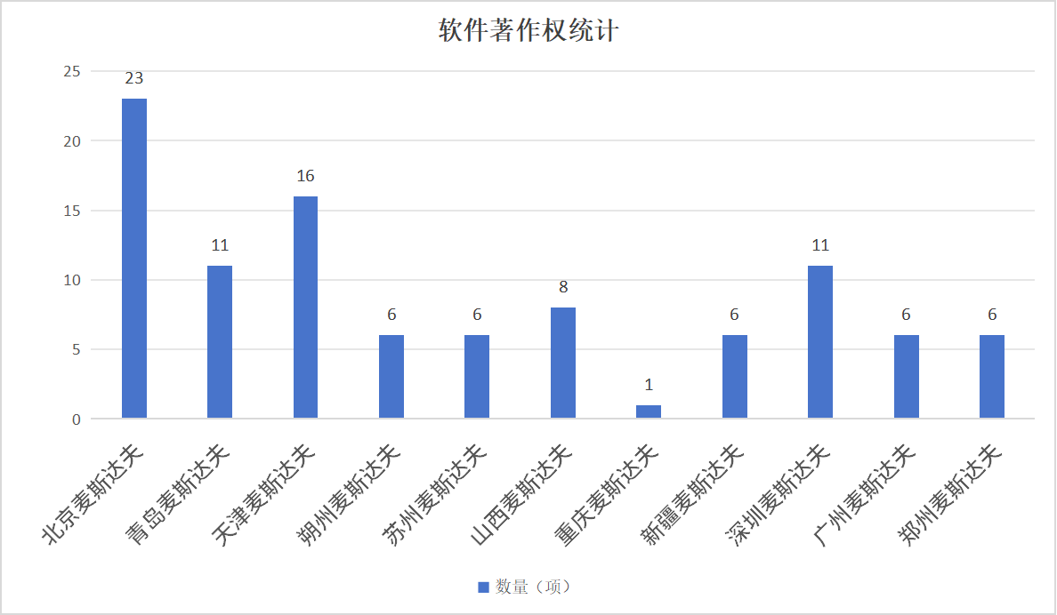 北京麦斯达夫凭借强大的研发实力,拥有23项软件著作权,涵盖多语言异构标准数据语义对齐系统、标准化成熟度数字孪生系统等多项技术领先成果;青岛麦斯达夫获批11项软件著作权,环卫服务标准化系统、售后服务标准化评价系统等均在其列;天津麦斯达夫以16项软件著作权展现出在政务服务、质量监测等方面的技术优势;朔州麦斯达夫拥有6项软件著作权,涉及碳减排量评估系统、基层检察服务标准化系统等;苏州麦斯达夫的6项软件著作权聚焦数智零售、营养健康、工业安防等方向;山西麦斯达夫凭借8项软件著作权,在知识图谱、特色专业镇、区域公共品牌等领域发力;重庆麦斯达夫聚焦标准创新型企业梯度培育深挖数字化服务;新疆麦斯达夫的6项软件著作权全部集中在碳达峰碳中和领域。