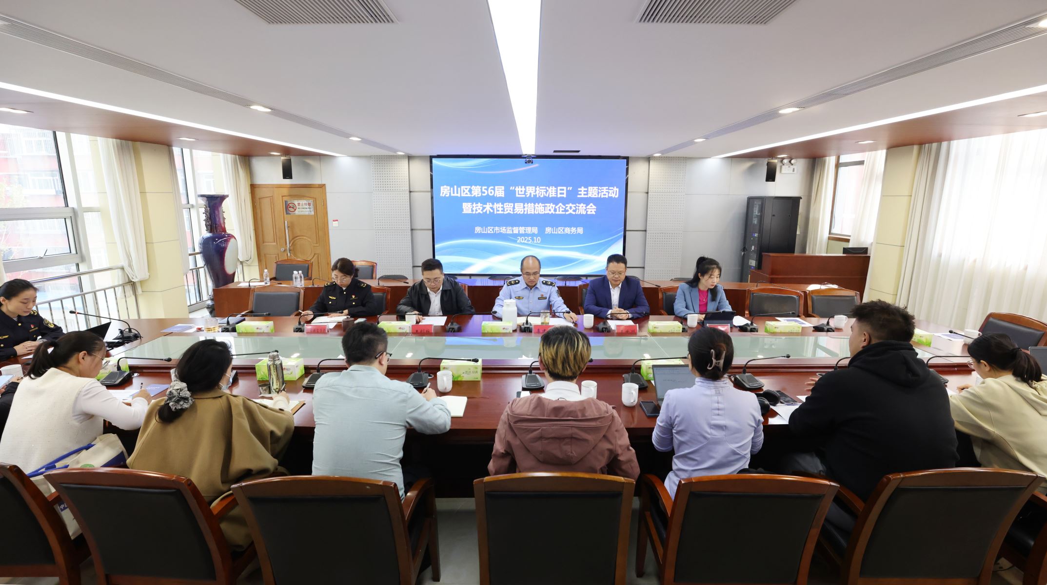 2025年10月15日,北京市房山区第56届“世界标准日”主题活动暨技术性贸易措施政企交流会成功举办。本次会议由房山区市场监督管理局主办,房山区商务局协办。房山区市场监督管理局党组成员、副局长李建国出席会议,区内二十余家外贸企业代表参会。
