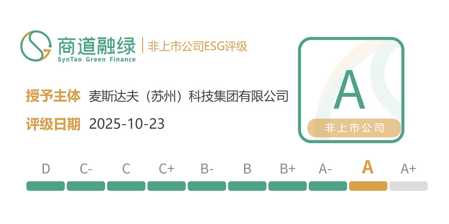 2025年10月23日,国内权威ESG评级机构商道融绿公布最新评级结果。麦斯达夫集团凭借在环境、社会及治理(ESG)领域的系统性实践和持续创新,一举斩获ESG评级A级,这既是对麦斯达夫在ESG领域长期投入和实践成果的高度肯定,更彰显了公司在可持续发展道路上的坚实步伐。