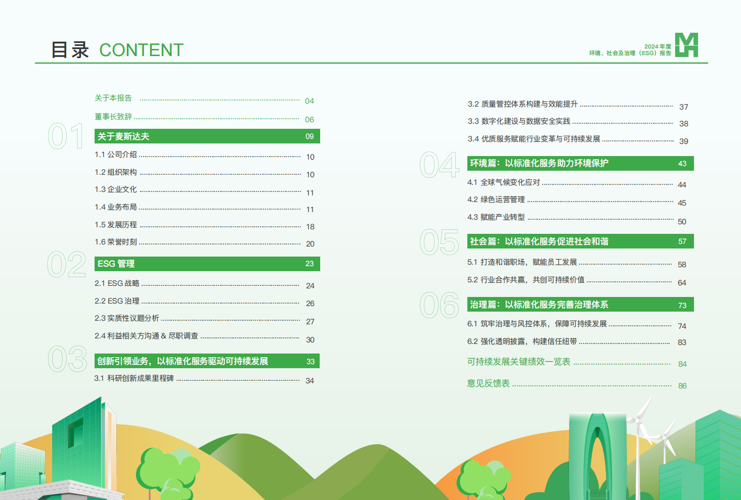 报告以可持续发展理念为核心,全面阐释了麦斯达夫集团如何将ESG要素深度融入企业战略和日常运营。在环境责任方面,集团积极响应国家“双碳”目标,持续推进节能降碳举措,提升绿色运营能力,不断夯实低碳发展路径。在社会责任领域,集团不仅关注员工权益保障和职业成长,构建和谐劳动关系,还致力于推动供应链可持续管理,打造协同发展的“标准化生态圈”,助力行业整体责任水平提升。在治理层面,集团持续优化现代企业治理架构,完善ESG组织体系和管理机制,将ESG理念全面纳入战略规划、决策流程和绩效评估,为企业可持续发展提供了坚实的制度保障。