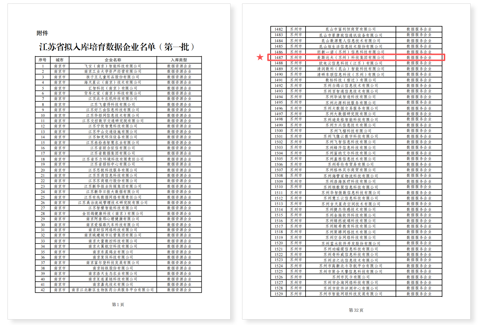 为贯彻落实江苏省人民政府关于培育壮大数据产业有关工作部署,加快建立数据企业培育库,繁荣数据产业生态,江苏省数据局组织开展了全省首批数据企业入库培育工作。经过企业自主申报、地市初审、省级复审等流程,确定首批3158家入库数据企业名单。麦斯达夫(苏州)科技集团有限公司凭借其在数据服务领域的扎实积累和创新能力,成功入选。