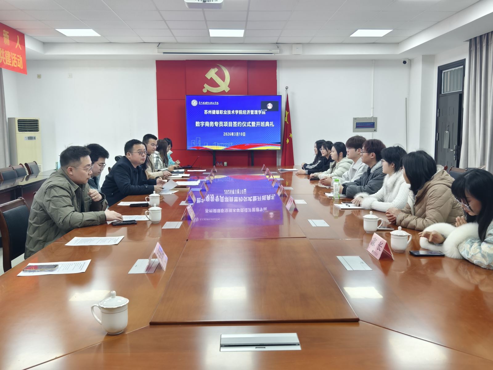 2026年3月10日,苏州健雄职业技术学院经济管理学院第一届“数字商务专员”项目签约仪式暨开班典礼在太仓举行。经济管理学院院长樊奇、党总支书记沈晓婷、党总支副书记李志辉、副院长傅兰,麦斯达夫(苏州)科技集团有限公司总经理王钊柱、苏州口水娃食品有限公司总经理谢一凡等企业代表出席活动,数字商务专员项目学生及家长共同参加。会议由经樊奇主持。