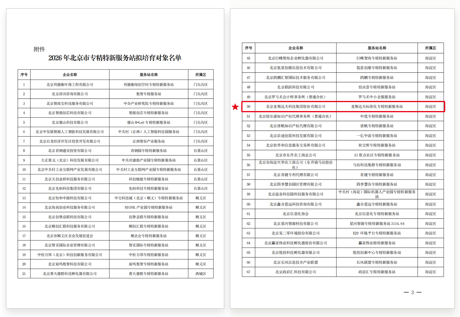 近日,北京麦斯达夫科技集团股份有限公司成功入选2026年北京市专精特新服务站培育对象,设立麦斯达夫标准化专精特新服务站。
