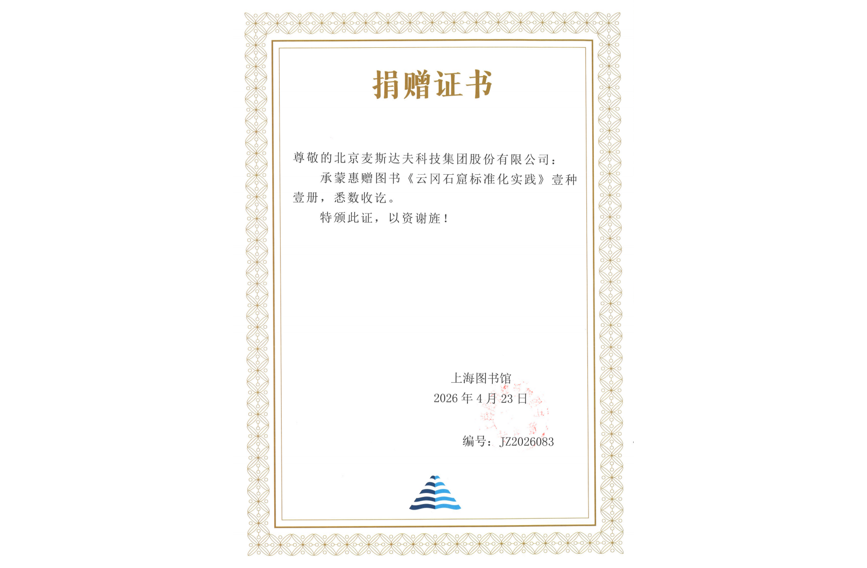 近日,由云冈研究院与北京麦斯达夫科技集团股份有限公司联合编写的《云冈石窟标准化实践》正式入藏上海图书馆,上海图书馆向我司颁发了捐赠证书,该书将作为馆藏文献永久保存并面向读者开放查阅。