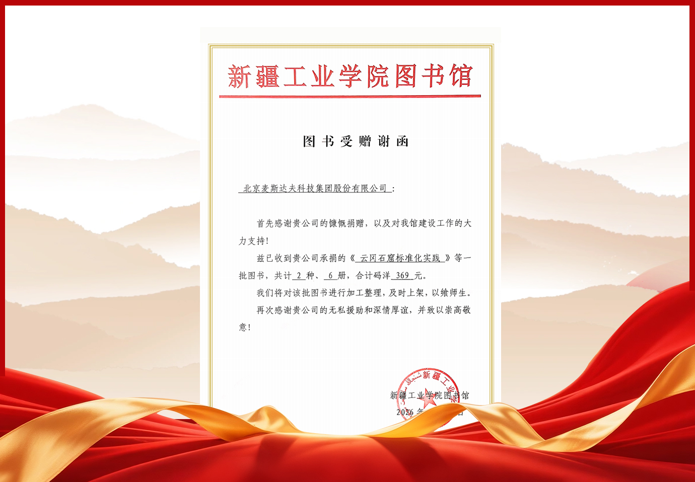 捐赠完成后,新疆工业学院图书馆特向我司发来“图书受赠谢函”,对公司的无私援助与大力支持表示感谢,称将对该批图书进行加工整理并及时上架,助力师生查阅使用。