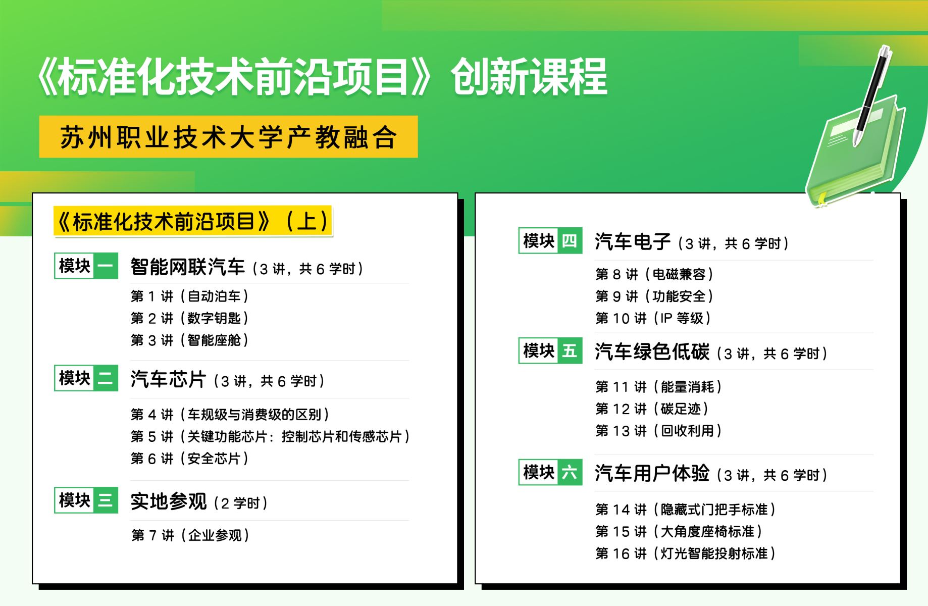 《标准化技术前沿项目》课程共设32讲、64课时,自本学期起正式纳入苏州职业技术大学机电工程学院“汽车标准化技术”微专业核心课程体系。麦斯达夫集团全面负责课程的教学实施,包括授课师资配备、课件教材开发、实训教具准备、课程标准制定、课后习题组编、线上微课录制和考核体系设计等环节,全方位保障课程质量和教学效果。