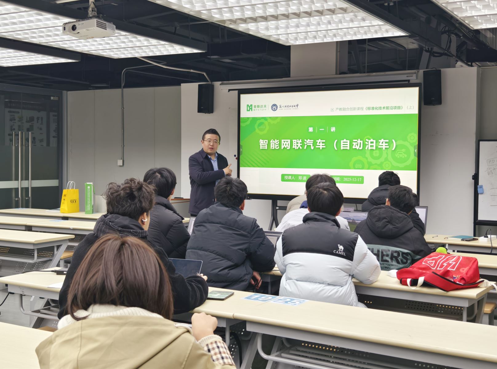 2025年12月17日,苏州职业技术大学和麦斯达夫集团校企合作共建的微专业“汽车标准化技术”核心课程——《标准化技术前沿项目》正式开课。该课程由麦斯达夫集团创始人、首席执行官郑波担任特聘教师,面向机电工程学院新能源汽车技术、机电一体化技术两个专业的二年级学生授课。此次开课标志着双方在汽车标准化领域的人才培养步入常态化、系统化教学新阶段。